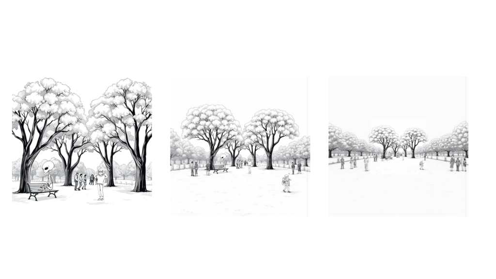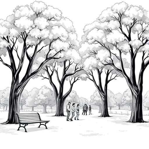 Location generated by flux in a line art style with the prompt “Park with lots of green trees. A park bench in the corner. Several people walking.”
