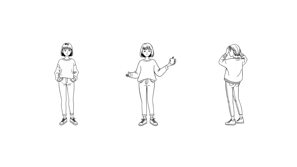 Consistency was finally achieved using simplistic sketch style images and prompt engineering. Once a reference character is generated, it can be manipulated to be in various poses by adjusting the prompt while using the same seed that was used to generate the reference image. This will preserve the characteristics so that it looks like the same character in a different pose.