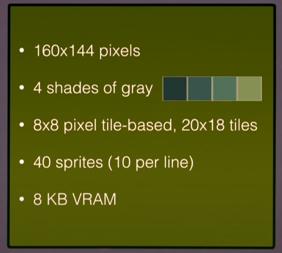 1 MHz* 8 bit | 8 KB | 8 KB | 160 x 144 | 4 (shades of gray) | 10 |